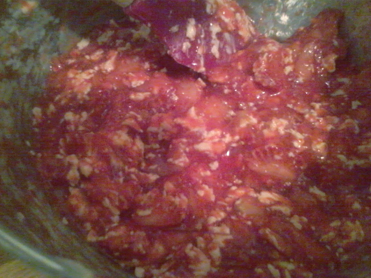| Strawberry Carrot Cake ½ c butter 16 oz strawberries ¾ c sugar 3 eggs ¼ c milk 1 tbsp baking powder ½ tsp salt 2 c flour 1½ c shredded carrots Heat oven to 350°. Grease a 9x13 pan. Beat strawberries a bit with a mixer to break them up. Add butter and beat well. Then mix in the sugar, and then the milk. Mix in the baking powder and salt, then add the flour, stirring just until mixed. Stir in the carrots. Pour into pan and bake 1 hour, apparently. |
